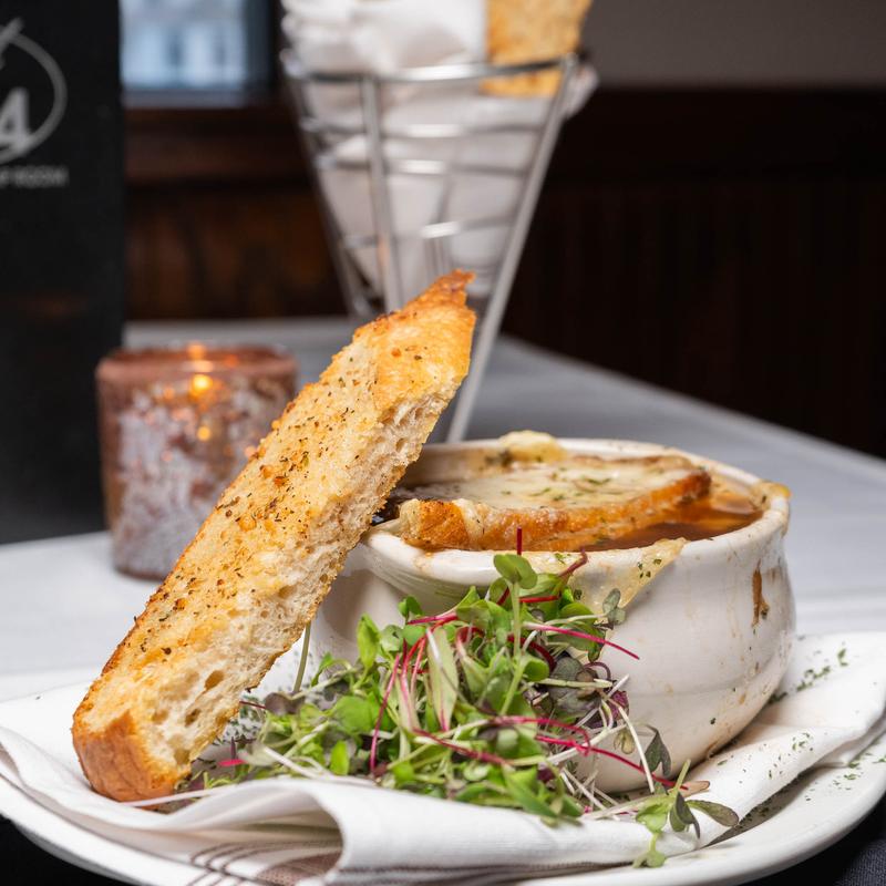 Caramelized and braised onions in our rich burgundy meat stock. Topped with crostini and melted Swiss cheese