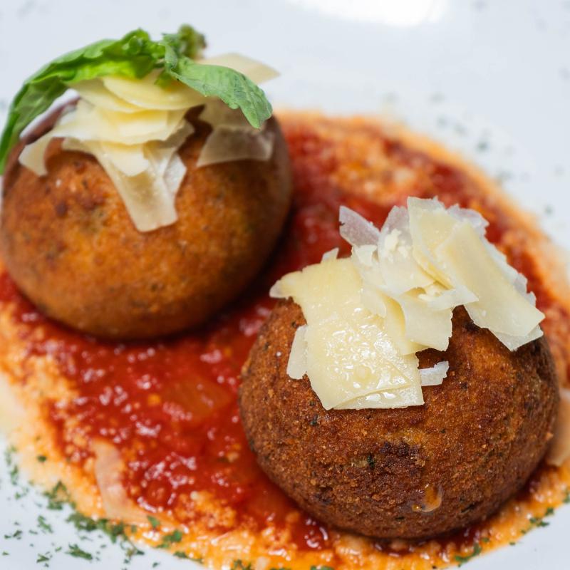 Beef, pea, and tomato stuffed risotto balls, served with marinara sauce