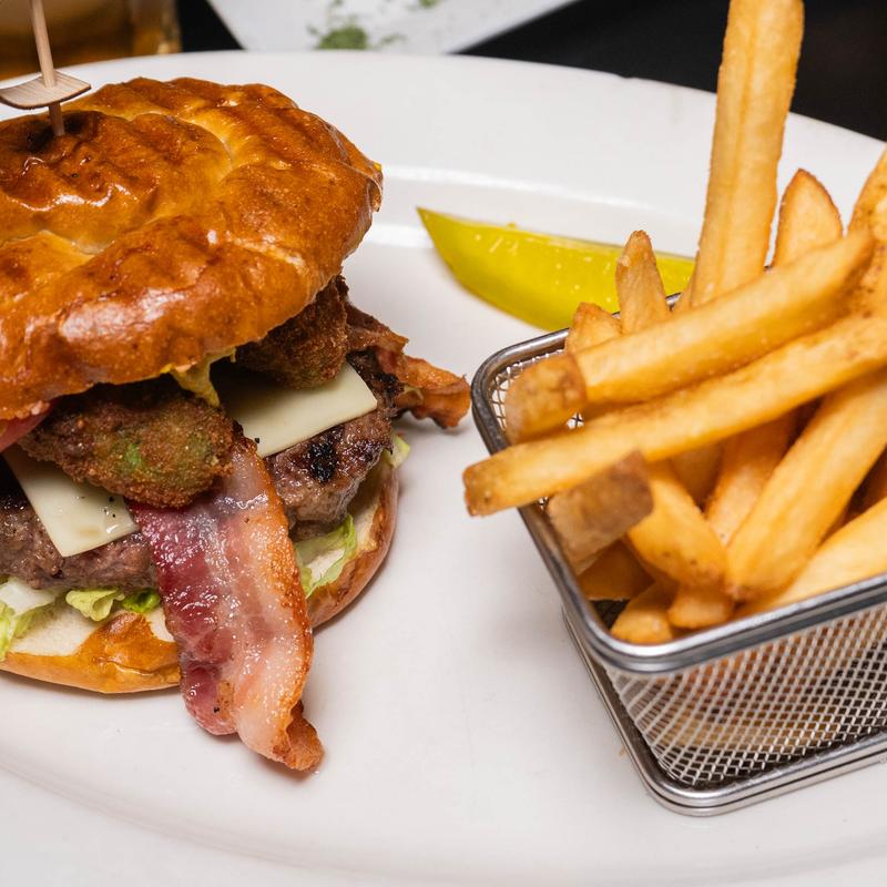 Pepper jack cheese, fried avocado, bacon, with a brew pub mustard, lettuce, and tomato on a pretzel bun with house fries and a pickle