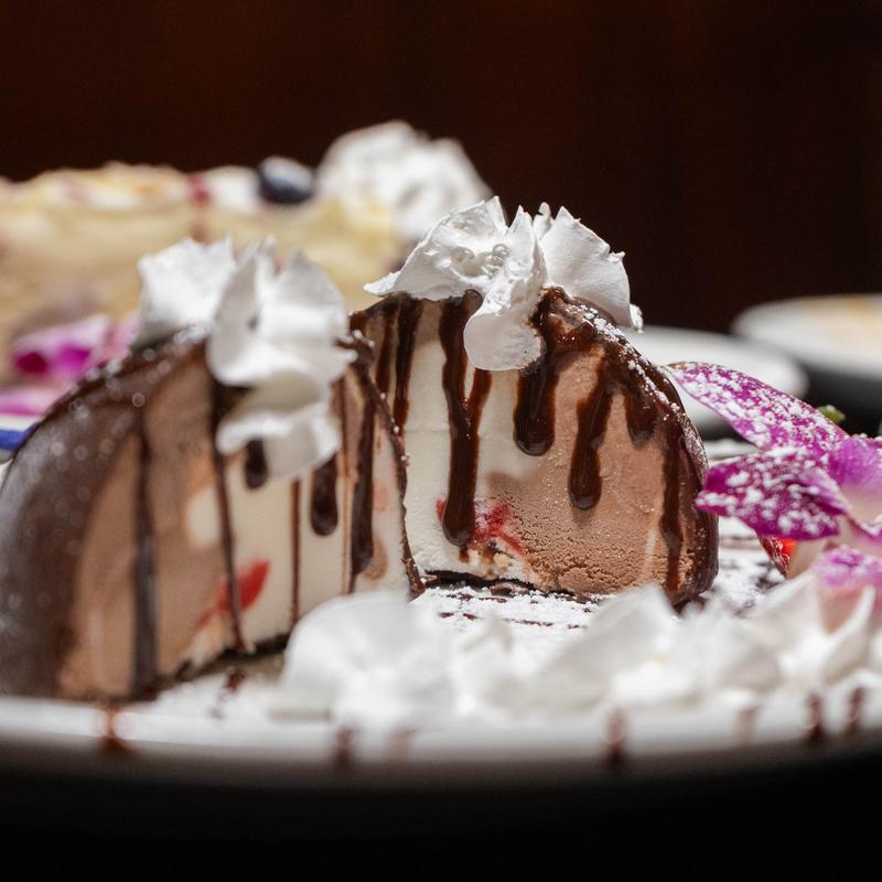 Classic vanilla and choclate gelato separated by a cherry and sliced cinnamon-covered almonds, finished with a chocolate coating