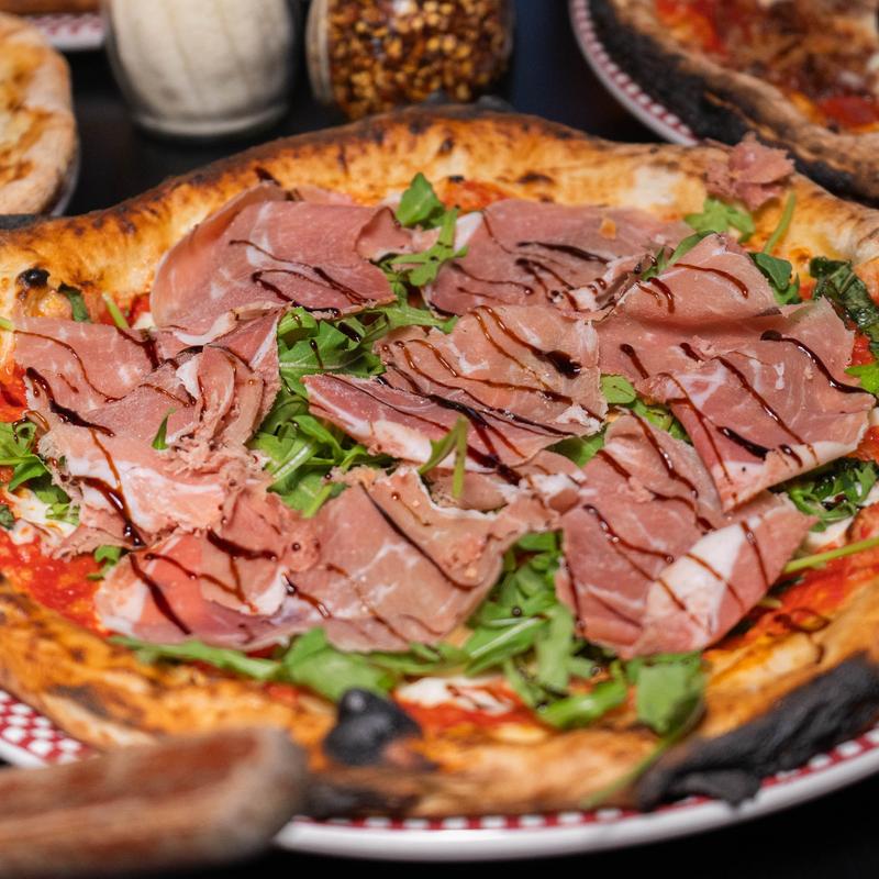 DOP San Marzano tomato sauce with tomato, fresh mozzarella, arugula, sliced prosciutto Di Parma, drizzled with balsamic glaze