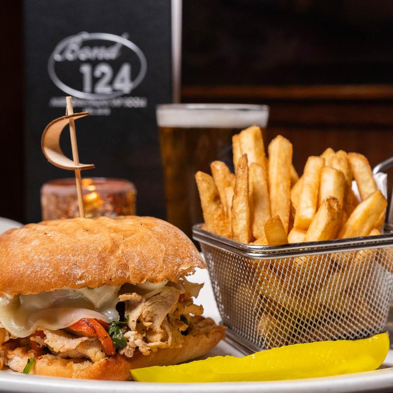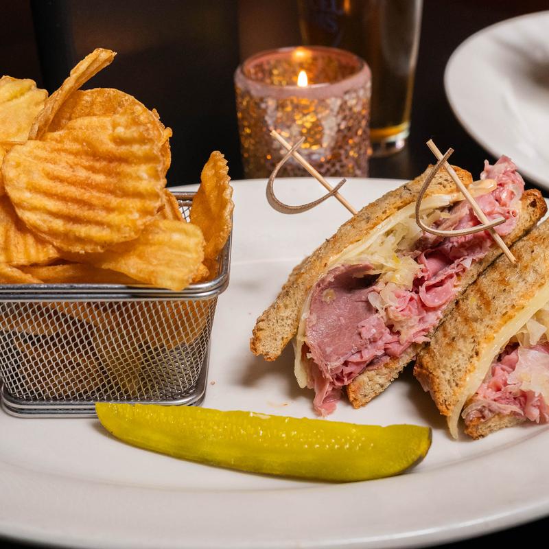 All served with hand-cut chips and pickle with a choice of mustard, mayo, lettuce, tomato, and choice of cheese: Swiss, American, provolone, gorgonzola, or cheddar on rye or brioche, extra charge for sauces