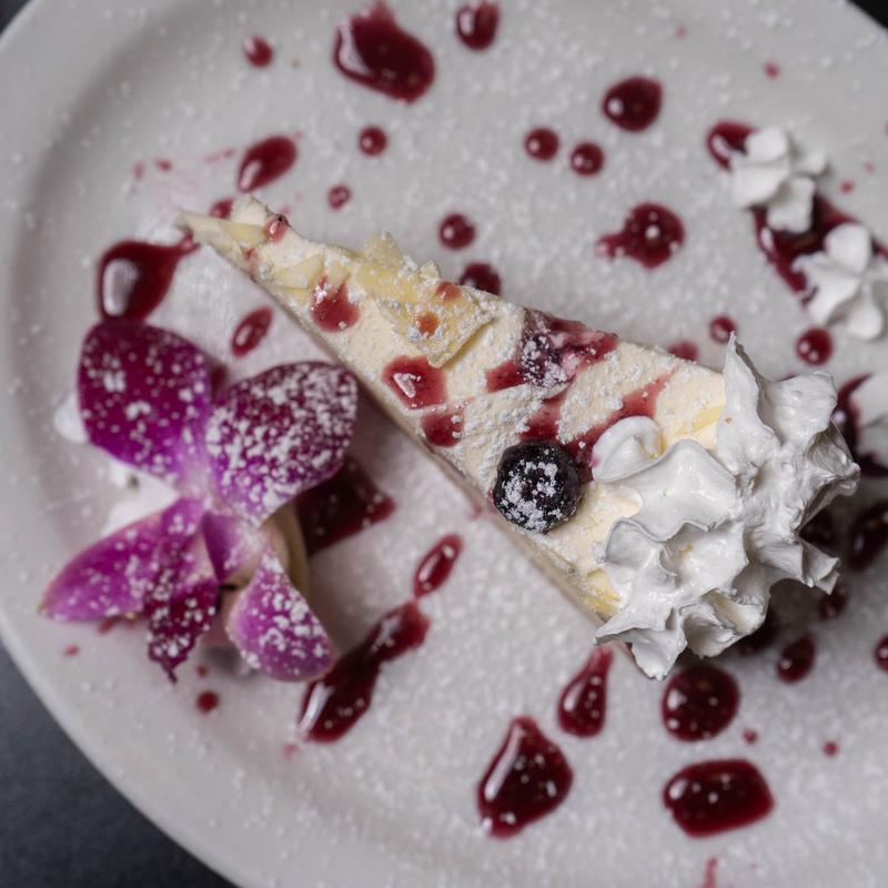 Creamy white chocolate cheesecake, moist chunks of vanilla-bean cream cake and sweet swirls of berry compote finished with pure whipping cream, white chocolate shavings & infused dried blueberries