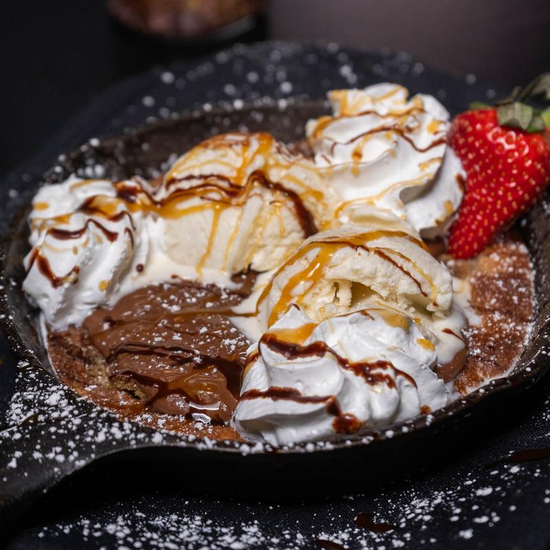 Warm baked cookie served with a scoop of vanilla ice cream, topped with caramel and Nutella drizzle